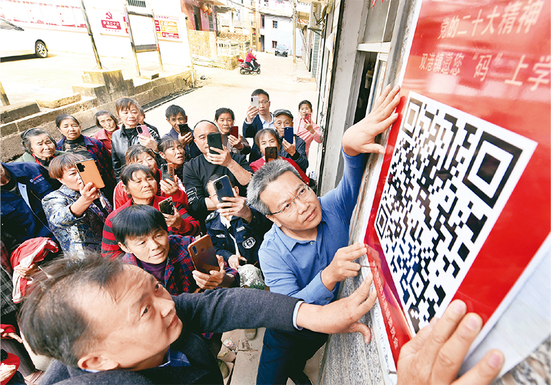 图为2022年11月13日,江西省鄱阳县双港镇党员干部将宣讲党的二十大精神的二维码贴在村头,吸引不少村民前来扫码学习了解有关知识。中新社发 卓忠伟/摄