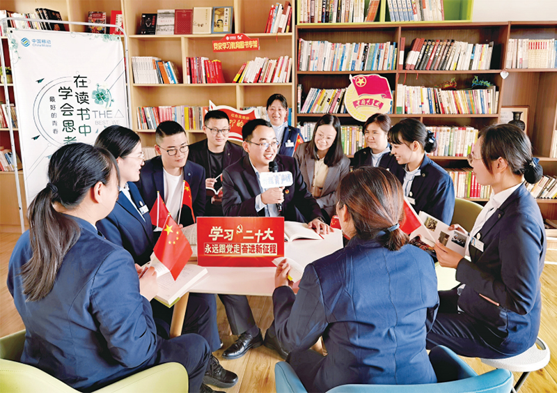 图为2022年10月28日,江苏移动“青年爱研习”宣讲“青骑兵队”向一线员工宣讲党的二十大精神。 江苏移动团委供图