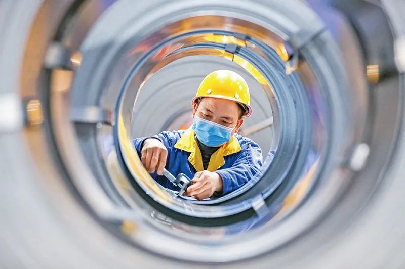 民营经济作为社会主义市场经济的重要组成部分,在扩大就业、改善民生、促进创业创新方面承担着重要角色,是促进经济增长、实现经济稳定运行的重要力量。图为2023年1月1日,浙江省湖州市德清县雷甸镇的一家民营企业生产车间里,工人们正加紧赶制一批高精度特种钢带订单,全力冲刺新年“开门红”。人民图片 王树成/摄
