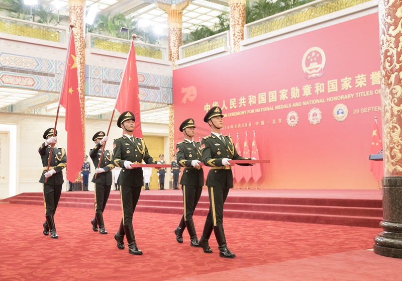 2019年9月29日,中华人民共和国国家勋章和国家荣誉称号颁授仪式在北京人民大会堂隆重举行。图为礼兵护送“共和国勋章”“友谊勋章”和国家荣誉称号奖章入场。新华社记者 丁海涛/摄