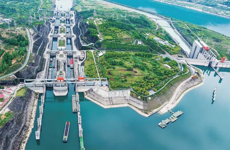 过去五年,三峡船闸航运效益节节攀升,年货运量连续五年突破1亿吨,累计过闸货运量超7.3亿吨,成为长江经济带高质量发展重要物流通道。图为2023年4月24日,船舶有序通过三峡双线五级船闸。新华社发 郑家裕/摄