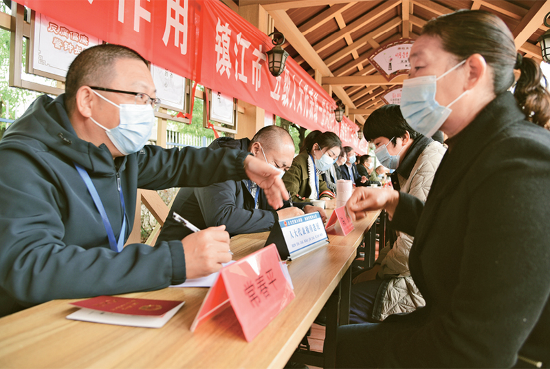 2022年11月18日,江苏省镇江市开展“五级人大代表接待选民日”活动,各级人大代表分别走进全市各地的村和社区接待选民,面对面听取群众对经济发展、城市建设、社会治理、民生保障等方面的意见和建议,助力经济和社会事业高质量发展。图为当日人大代表在镇江市和平路街道新金江社区听取选民的意见和建议。 人民图片 石玉成/摄