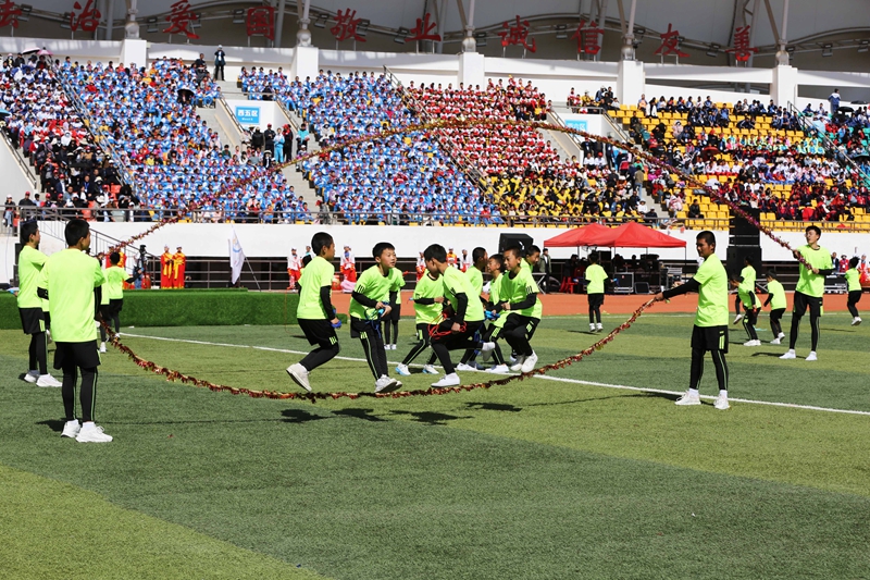 2023年4月26日,甘肃省定西市安定区举办以“启航新征程,筑梦新时代”为主题的第一届中小学生体育艺术节,来自全区各学校的中小学生代表表演丰富多彩的节目,展现艺术才华和青春风采。图为学生在定西市体育馆表演“‘绳’彩飞扬”。 新华社发 王克贤/摄