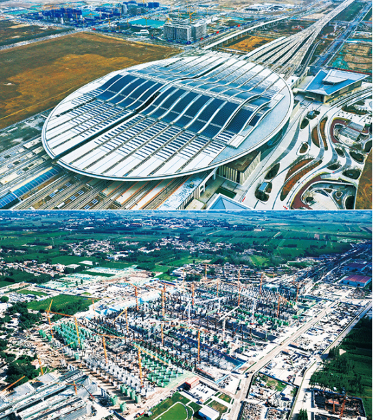 2017年,设立河北雄安新区的消息如春雷乍响,从白洋淀畔传遍大江南北。雄安新区,从“一张白纸”着墨,每天都在积蓄力量、不断发展。六载光阴,从顶层设计规划到如火如荼大规模建设,一座现代化的城市如今已显现雏形。图为拼版照片:上图为2023年3月23日拍摄的京雄城际铁路雄安站;下图为2019年8月29日拍摄的京雄城际铁路雄安站建设现场。新华社记者 牟宇/摄