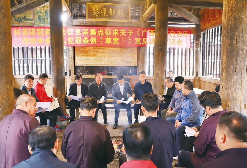广西壮族自治区三江侗族自治县人大常委会基层立法联系点的设立,密切了当地少数民族群众与国家立法机关的联系,推动了民族地区民主法治建设进程,让百里侗乡群众的声音直通国家立法机关。图为当地立法联络员结合侗族传统“鼓楼议事”,使之成为立法联系群众的重要载体。 广西壮族自治区三江侗族自治县人大常委会供图 覃伟/摄
