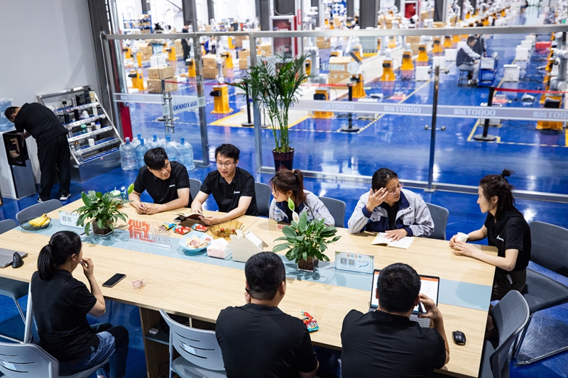 图为2023年5月26日,一家科技企业生产线旁的“职工微家”内,职工正在聊天交流。 工人日报记者 王伟伟/摄