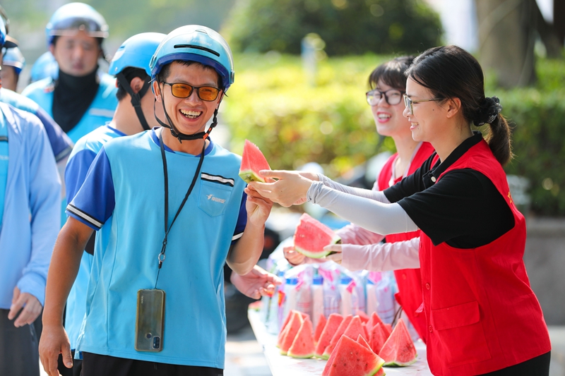 图为2022年7月25日,浙江省湖州市德清县武康街道总工会开展“关爱外卖员 爱心降酷暑”夏日送清凉活动,为辖区外卖员送去水果、洗漱套装及防暑药品等,让他们在炎炎夏日感受清凉和关怀。 中新社发 王正/摄