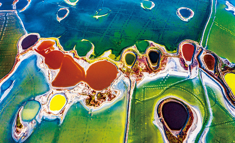 党的十八大以来,水利部门深入实施水生态保护治理,推动江河湖泊面貌实现根本性改善。图为山西运城盐湖色彩斑斓的景观(无人机照片)。 新华社发 薛俊/摄
