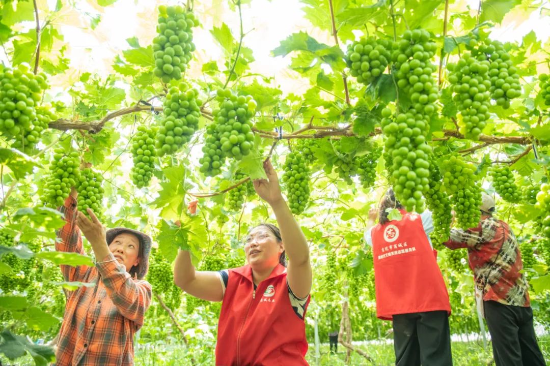 近年来,江苏省宿迁市宿城区支口街道大力实施党建引领强村富民工程,采取“党建+合作社+农户”运作模式,组织党员志愿者走进田间地头生产一线,引导群众因地制宜发展山楂、葡萄等特色产业种植,拓宽增收渠道,助力乡村振兴。图为2023年6月30日,在宿迁市宿城区支口街道探楚社区葡萄种植基地,党员志愿者和果农一起管护葡萄。 人民图片 徐江海/摄