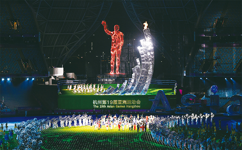 党的十八大以来,在习近平新时代中国特色社会主义思想指引下,我国各项事业取得历史性成就、发生历史性变革。在刚刚闭幕的杭州第19届亚洲运动会上,从首创“亚运数字火炬手”到推出电子身份注册卡、探索使用5.5G新技术……数字赋能、科技助力,让世界看到了中国的科技实力和东方文化的魅力。图为2023年10月8日,在杭州亚运会闭幕式上,数字火炬手“弄潮儿”向现场观众挥手致意。 新华社记者 王鹏/摄