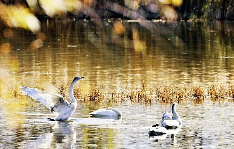 近年来,北京市水务局密云水库管理部门大力开展以自然恢复为主、人工修复相结合的水生态保护与修复和生态环境治理,推进山水林田湖草精细化管理工作,提高库区生物多样性丰富度,为动植物提供了优质的生存环境,也提升了密云水库的生态环境和水质。图为2022年11月15日,天鹅在密云水库流域的清水河内栖息觅食。 新华社记者 李欣/摄