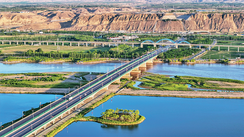 图为2023年6月13日,位于宁夏中卫的黄河公路大桥、黄河铁路大桥与黄河湿地交相辉映,美丽如画。 人民图片 柴更利/摄