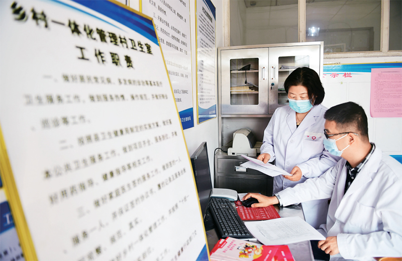 近期,河北省沧州市盐山县招聘了一批大学生村医,充实了乡村卫生健康人才队伍,提升了村级卫生室技术能力和服务水平。这些大学生村医纳入乡镇卫生院编制统一管理,落实相关待遇保障与激励政策,让大学生村医干得好、留得住,更好地服务基层群众。图为盐山县孟店镇东大辛村大学生村医赵磊(右)在村卫生室整理村民健康档案。 新华社发 傅新春/摄