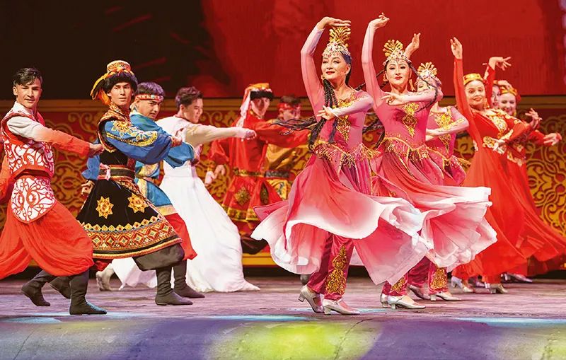 2023年7月20日,第六届中国新疆国际民族舞蹈节在乌鲁木齐开幕。本届舞蹈节以“舞动梦想 和美丝路”为主题。图为演员在开幕式上表演。新华社记者 胡虎虎/摄
