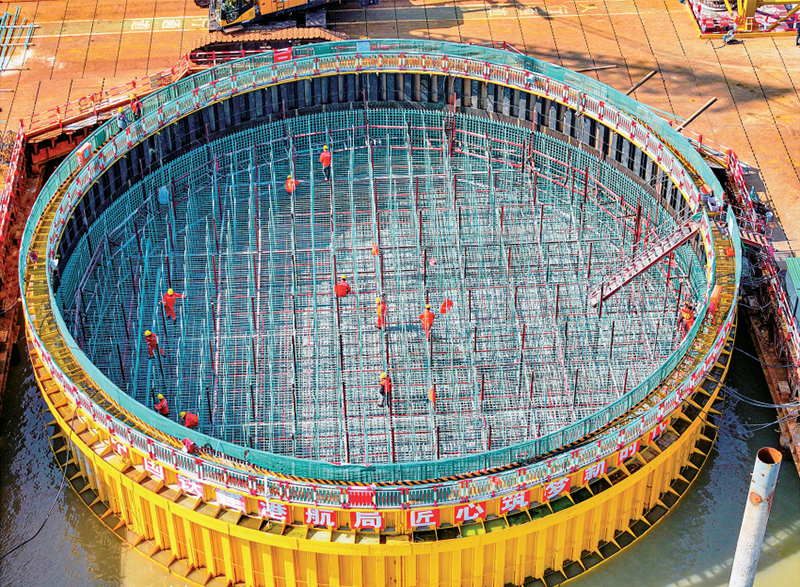 重大基础设施建设是牵引有效投资的“强引擎”。财政部门要优化财政支出结构,加大对重大项目建设投入力度。图为2024年2月14日,浙江宁波舟山港六横公路大桥二期工程双屿门特大桥佛渡岛侧主墩建设现场,工人们正在进行承台钢筋绑扎施工。人民图片 姚峰/摄