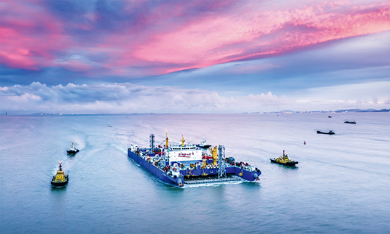 2023年6月11日,由中交一航局第二工程有限公司参与施工的国家重大工程深中通道海底沉管隧道最终接头合龙。图为2023年6月8日,“一航津安1”号沉管运输安装一体船将E23管节和最终接头浮运至安装现场。 新华社发