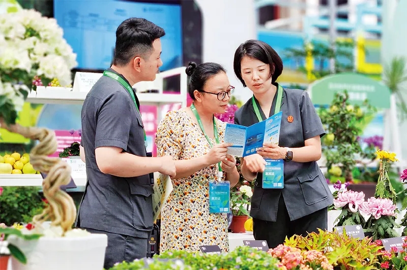 2023年9月11日,第三十届中国北京种业大会开幕。北京知识产权法院入驻种业大会知识产权保护工作站,深度参与种业大会,高质量服务种业发展。图为种业大会开幕当日,北京知识产权法院法官向花卉展商发放该院为本次展会专门制作的普法宣传材料。 最高人民法院供图