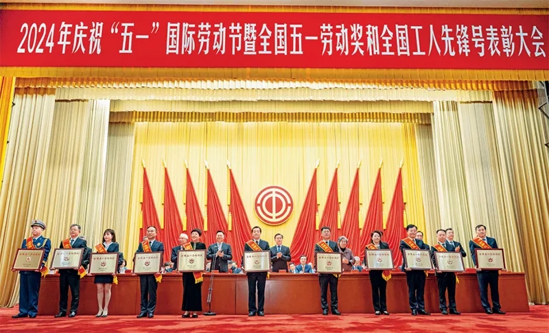 2024年庆祝“五一”国际劳动节暨全国五一劳动奖和全国工人先锋号表彰大会4月28日在北京人民大会堂举行。255个集体和1088名个人分获全国五一劳动奖状、奖章,1034个集体获全国工人先锋号。图为荣获全国五一劳动奖状的部分集体代表在大会上合影。新华社记者 才扬/摄