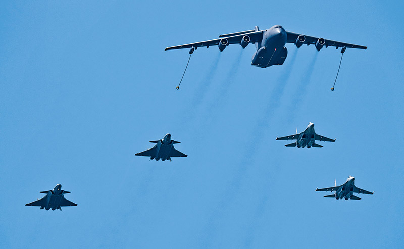 图为2023年7月24日,在长春空军航空开放活动预演当天,运油20同时与歼20、歼16飞机空中加油通场展示。中国航空工业集团供图 岳书华/摄