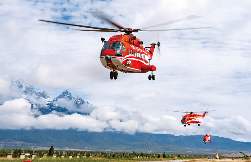 2023年5月16日,国家“应急使命·2023”高山峡谷地区地震灾害空地一体化联合救援演习中,直8系列直升机担负直升机空中侦察、编队突入灾区、水域搜救、空地协同营救灭火等任务。图为救援演习现场三架直8A直升机编队起飞执行任务。中国航空工业集团供图 岳书华/摄