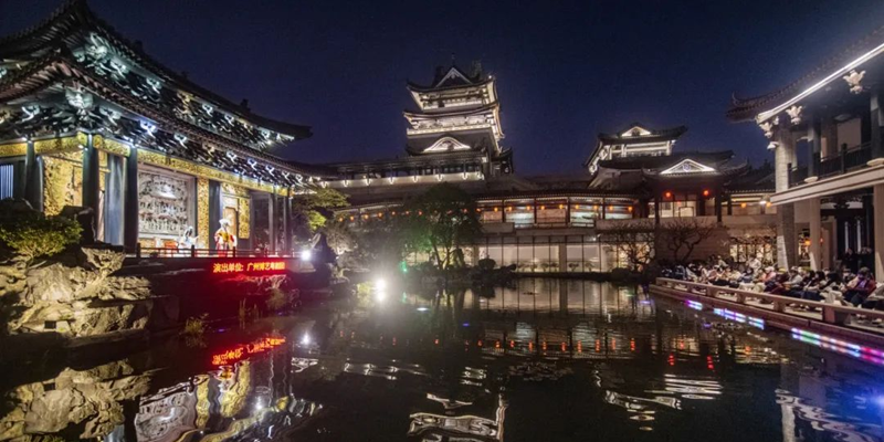 图为粤剧艺术博物馆广福戏台的夜场粤剧演出,观众与演员隔湖相守,共同享受戏韵魅力。广州市荔湾区融媒体中心供图