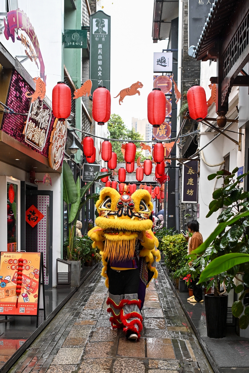 图为醒狮队伍在永庆坊内进行贺新春表演。中新社记者 陈骥旻/摄