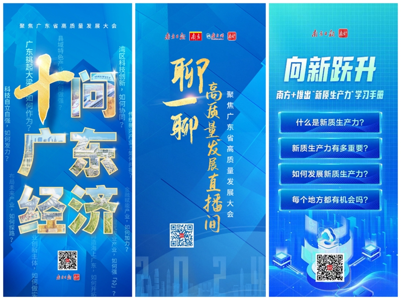 图为“南方+”推出的“十问广东经济”、“聊一聊高质量发展直播间”、“‘新质生产力’学习手册”等融媒体报道,推动党的创新理论在网上讲得开、讲得响。南方报业传媒集团供图