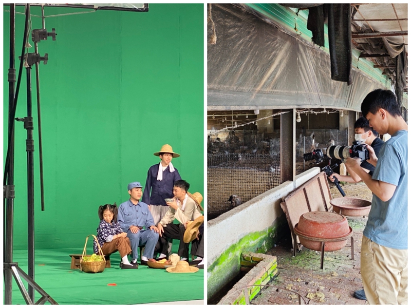 宣传报道中,南方报业传媒集团注重扎根实践,用多种手段展示从理论破题到实践推进的经过。左图为记者们在虚拟摄影棚拍摄录制献礼片《心·颂》;右图为在“整活了@广东百县千镇万村”系列视频的采访制作过程中,记者到潮州市饶平县拍摄采访当地狮头鹅养殖。南方报业传媒集团供图