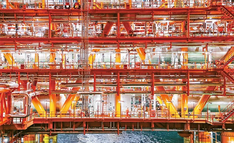 近年来,我国坚持创新引领,加快发展新质生产力,重大工程科技含量持续攀升。2023年11月14日,中国海油宣布我国渤海首个千亿方大气田——渤中19—6气田Ⅰ期开发项目成功投产,标志着我国海上深层复杂潜山油气藏开发迈入新阶段。图为工作人员在渤中19—6气田作业。 新华社发 杜鹏辉/摄