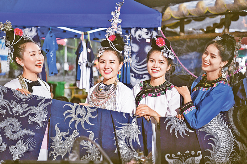 在“村超”系列赛事的带动下,贵州省黔东南苗族侗族自治州榕江县吸引了全国各地大量游客前往观赛游玩,带动了当地旅游、餐饮、住宿、文创、农特产品等行业的发展。图为2023年6月30日,村民在“村超”赛场旁的文创摊位展示民族服饰。新华社记者 杨文斌/摄