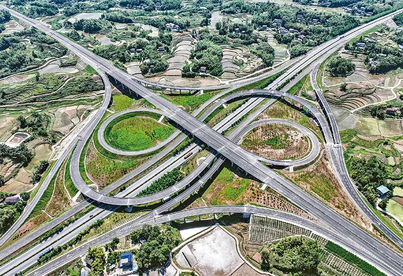 成渝地区双城经济圈建设重点项目之一的重庆梁平至四川开江高速公路(梁开高速)重庆段于2024年4月30日0时正式通车。梁开高速建成后,将辐射川渝两地20个乡镇,带动相关产业尤其是旅游业发展。图为2024年4月28日拍摄的重庆市梁平区境内梁开高速与张南高速联通的齐河枢纽互通。新华社记者 唐奕/摄