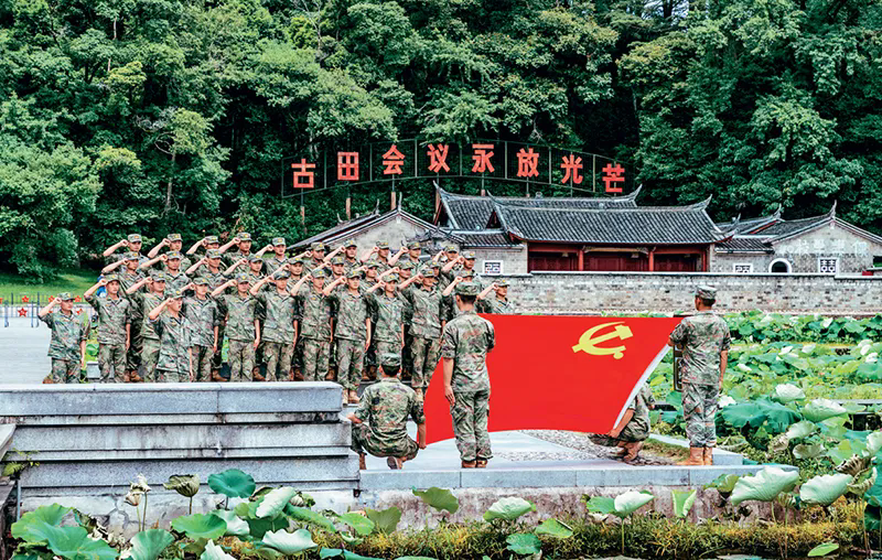 2023年“七一”前夕,陆军第73集团军某旅组织官兵来到古田会议旧址,开展向党旗宣誓活动,激励官兵听党指挥、奋斗强军。 解放军画报供图 曾冰阳/摄