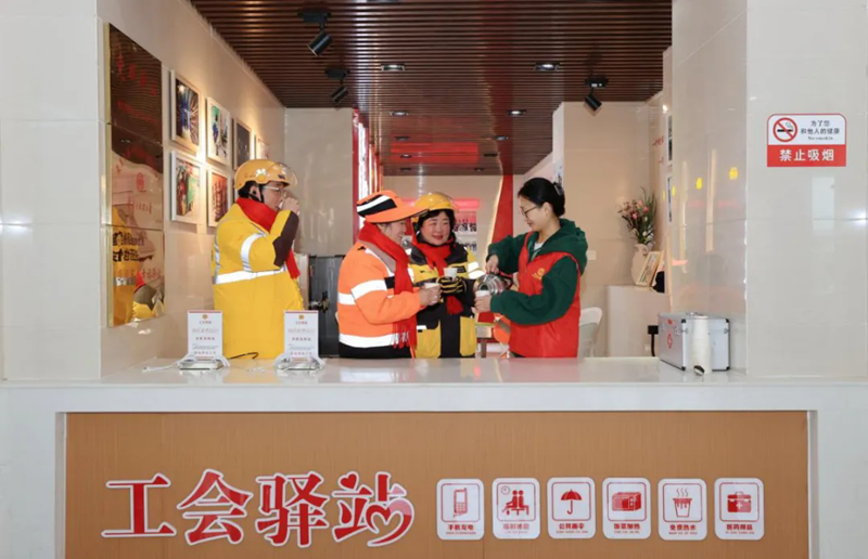 图为2023年12月19日,安徽省淮北市职工服务中心工会驿站内,志愿者为户外劳动者提供防寒姜茶。 安徽省淮北市总工会 张锋/摄
