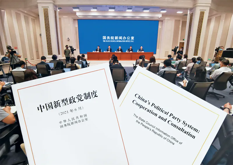 国务院新闻办公室于2021年6月25日发布《中国新型政党制度》白皮书,并举行新闻发布会。这部白皮书全面回顾了中国新型政党制度的产生、发展和不断完善的历程,介绍了这一制度的鲜明特色,总结了长期以来特别是中共十八大以来中国新型政党制度建设取得的重要成果和成功经验。图为新闻发布会现场。 中央统战部供图