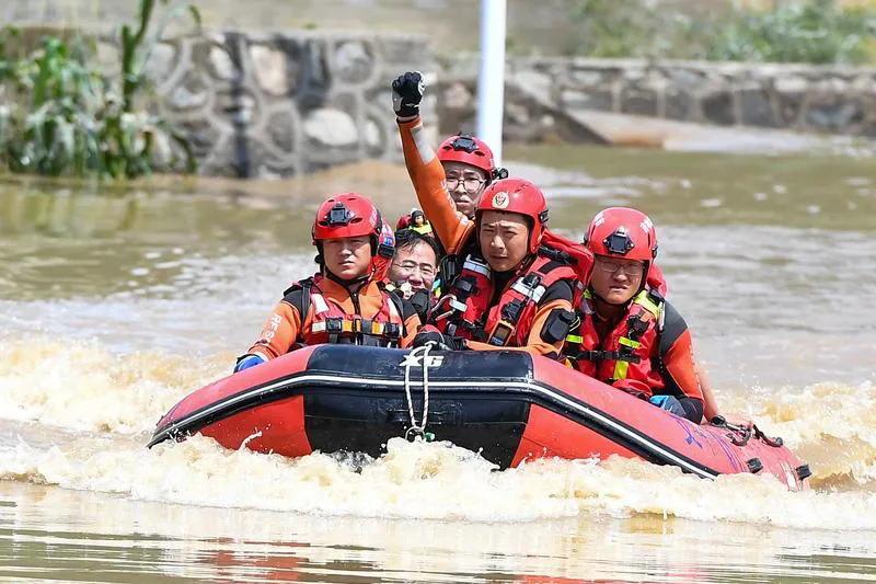 图为2024年7月29日,吉林省临江市因遭遇严重暴雨导致洪涝灾害,救援人员在转运受困群众时用手势指挥队员操控船只。新华社记者 张楠/摄