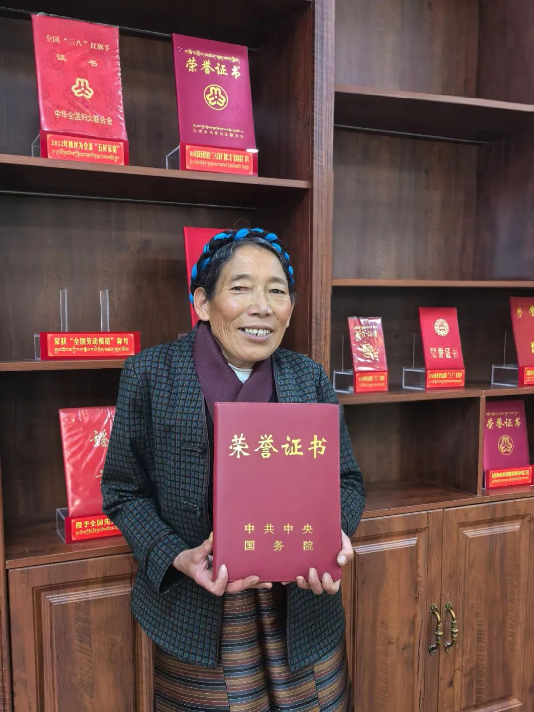 图为次仁宗巴捧起珍爱的荣誉证书。她曾荣获“全国劳动模范”、“全国三八红旗手”、“全国自强模范”、“全国五好家庭”等称号。 王文婷/摄