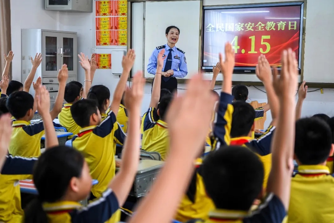 图为2024年4月15日,在广西兴业县一所小学内,公安民警在讲解国家安全相关知识的过程中与学生们互动。 新华社记者 曹祎铭/摄