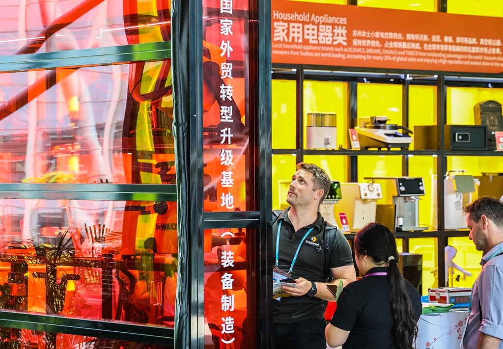 2024年10月15日,以“服务高质量发展,推进高水平开放”为主题的第136届广交会拉开帷幕。图为10月15日,采购商在第136届广交会“国家外贸转型升级基地”展区的江苏苏州展台洽谈。新华社记者 刘大伟/摄