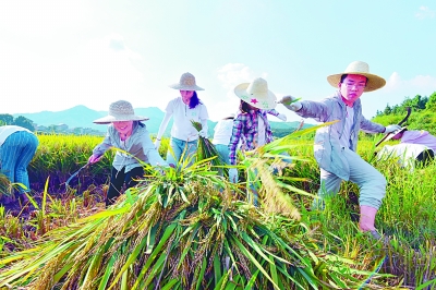 江西师范大学暑期社会实践团队学生正在帮助农民收割稻子。光明图片/视觉中国