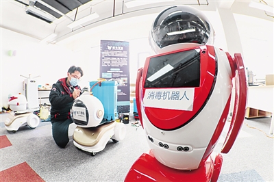 无人驾驶消毒机器人应用于疫情防控一线。解豪摄/光明图片