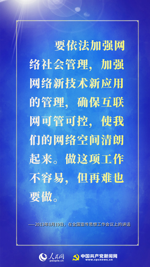 ★ 要深入开展网上舆论斗争,严密防范和抑制网上攻击渗透行为,组织力量对错误思想观点进行批驳。要依法加强网络社会管理,加强网络新技术新应用的管理,确保互联网可管可控,使我们的网络空间清朗起来。做这项工作不容易,但再难也要做。