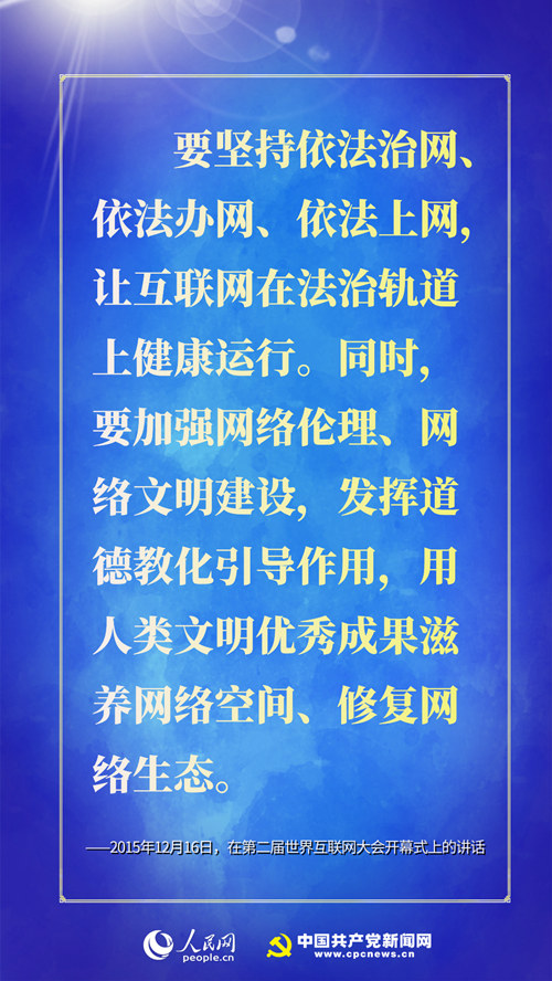 ★ 要坚持依法治网、依法办网、依法上网,让互联网在法治轨道上健康运行。同时,要加强网络伦理、网络文明建设,发挥道德教化引导作用,用人类文明优秀成果滋养网络空间、修复网络生态。