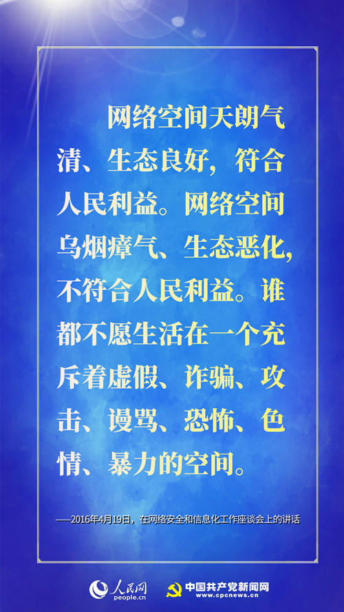 ★ 网络空间是亿万民众共同的精神家园。网络空间天朗气清、生态良好,符合人民利益。网络空间乌烟瘴气、生态恶化,不符合人民利益。谁都不愿生活在一个充斥着虚假、诈骗、攻击、谩骂、恐怖、色情、暴力的空间。