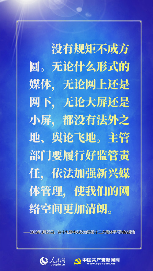 ★ 没有规矩不成方圆。无论什么形式的媒体,无论网上还是网下,无论大屏还是小屏,都没有法外之地、舆论飞地。主管部门要履行好监管责任,依法加强新兴媒体管理,使我们的网络空间更加清朗。