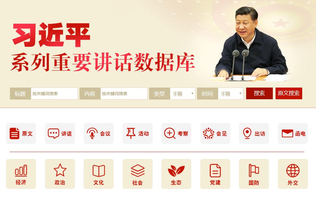 党的十八大以来,习近平总书记在出席会议、考察参观、出访等不同场合下多次发表重要讲话,很多精彩的话语在国内外广泛流传,成为金句。这些“习式金句”的背后,凝聚着以习近平同志为核心的党中央治国理政思想的精髓。“习近平系列重要讲话数据库”重点收录了十八大以来习近平总书记发表的系列重要讲话原文300余篇,相关重要论述、活动、会议、批示、书信、致辞、音视频等共计6000多篇,涵盖经济、政治、文化、社会、生态、党建、国防、外交等各个领域。数据库兼具资料性、可检索性等功能,党员干部及广大群众可以把数据库作为学习习近平总书记系列重要讲话精神的有效平台,也可以根据讲话发表的时间、内容或直接输入关键词来实现精准搜索阅读。此外,该数据库手机版也同步上线,用户可以通过手机端查询讲话内容,随时随地学习习近平系列重要讲话精神。