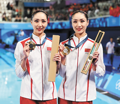 当地时间8月10日,王柳懿(左)/王芊懿在展示花样游泳双人项目金牌。本报记者 雷 声摄