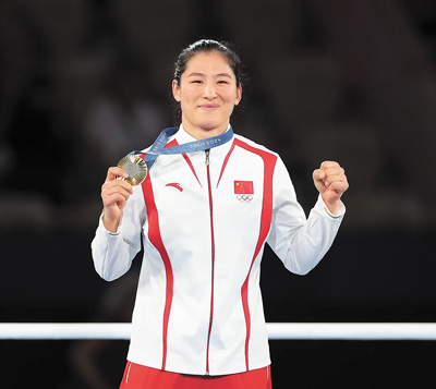 当地时间8月10日,李倩在展示拳击女子75公斤级金牌。本报记者 陶相安摄