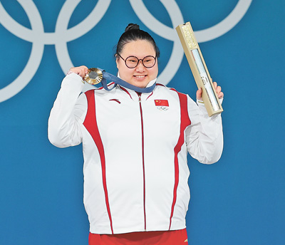 当地时间8月11日,李雯雯在展示举重女子81公斤以上级金牌。本报记者 厉衍飞摄