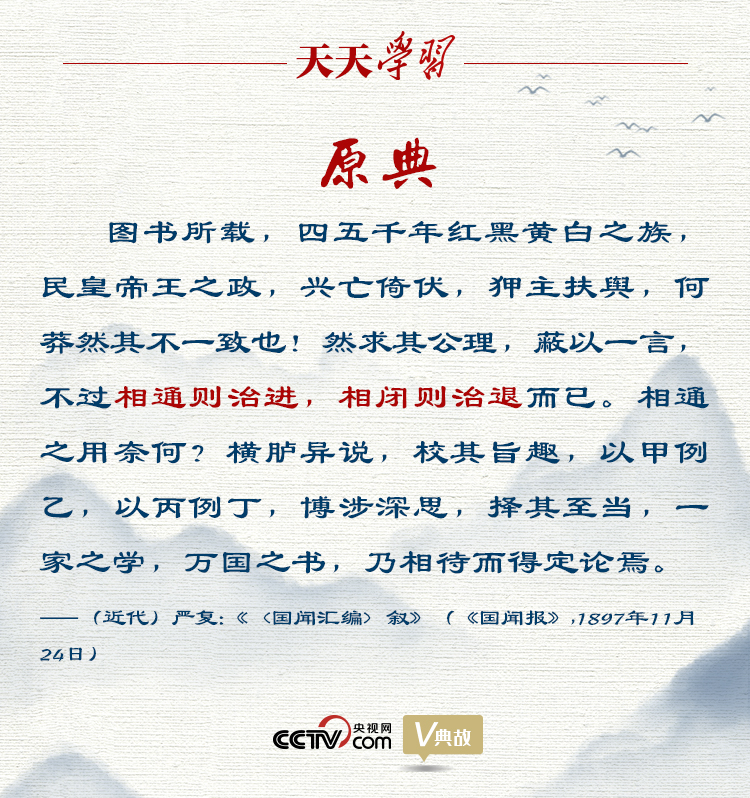 1840年鸦片战争后,西方列强用坚船利炮打开了古老中国的大门,中国逐渐沦为半殖民地半封建社会。严复把“闭”看作是造成中国所有问题的根源,认为只有“通”才能起到振衰起敝的作用。他提出“通上下之情”“通中外之故”,而尤以“通下情为要义”“通外情为要务”。在《〈国闻汇编〉叙》中,严复又提出“相通则治进,相闭则治退”,认为相互沟通交流治理能力就进步,相互封闭隔绝治理能力就后退,强调了“通”在时代变迁中的重要性。