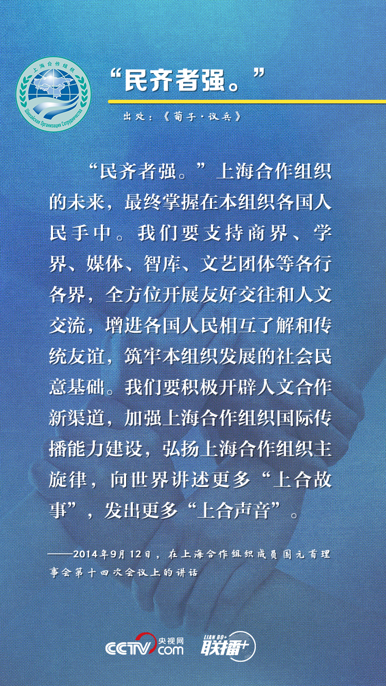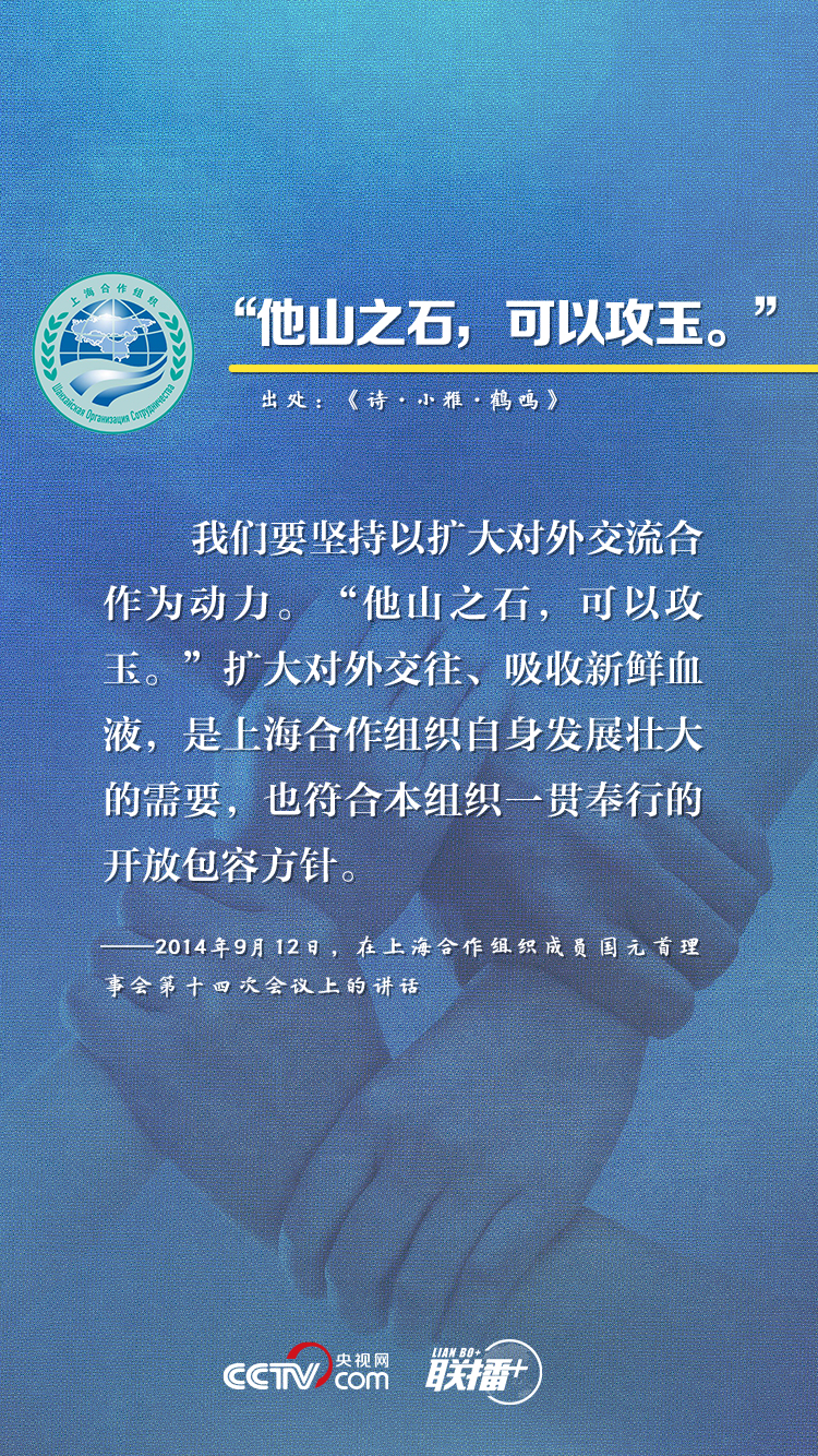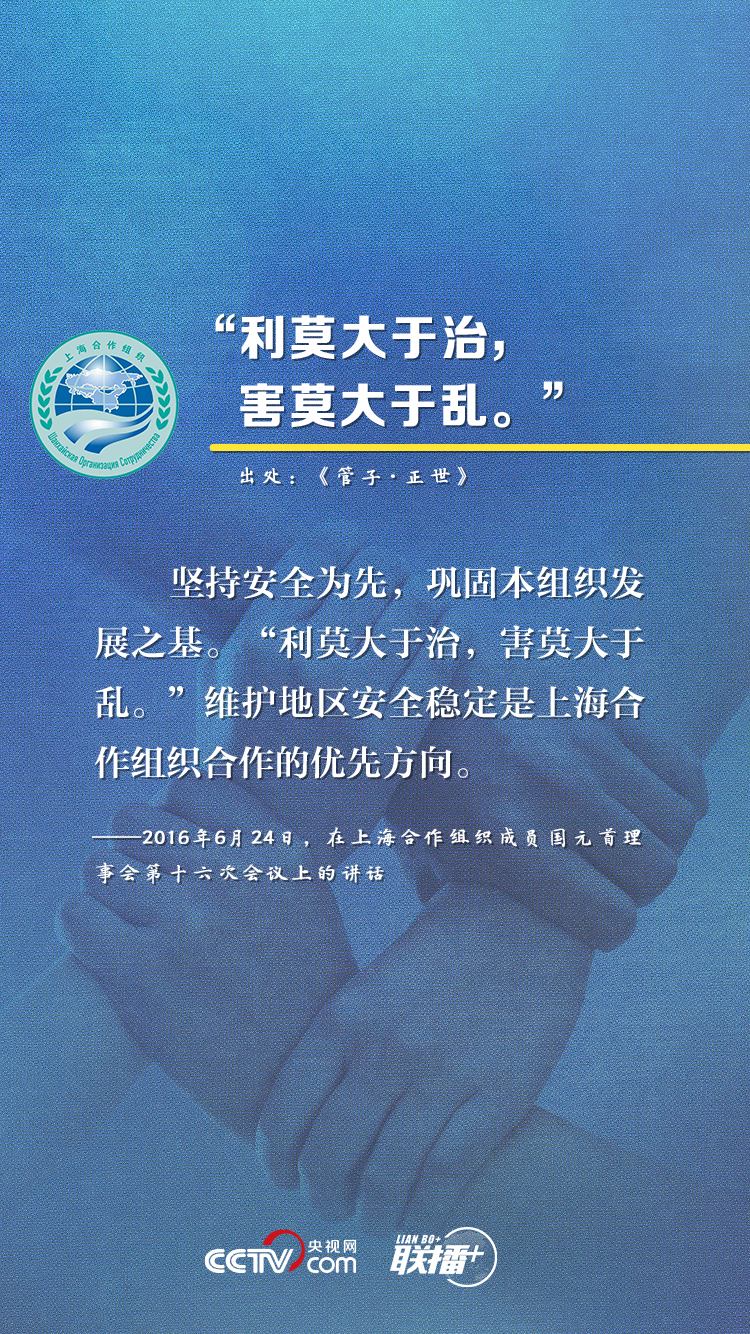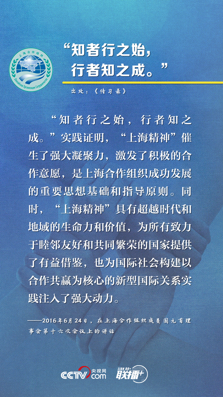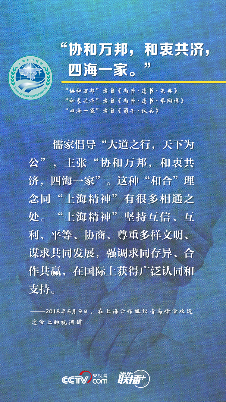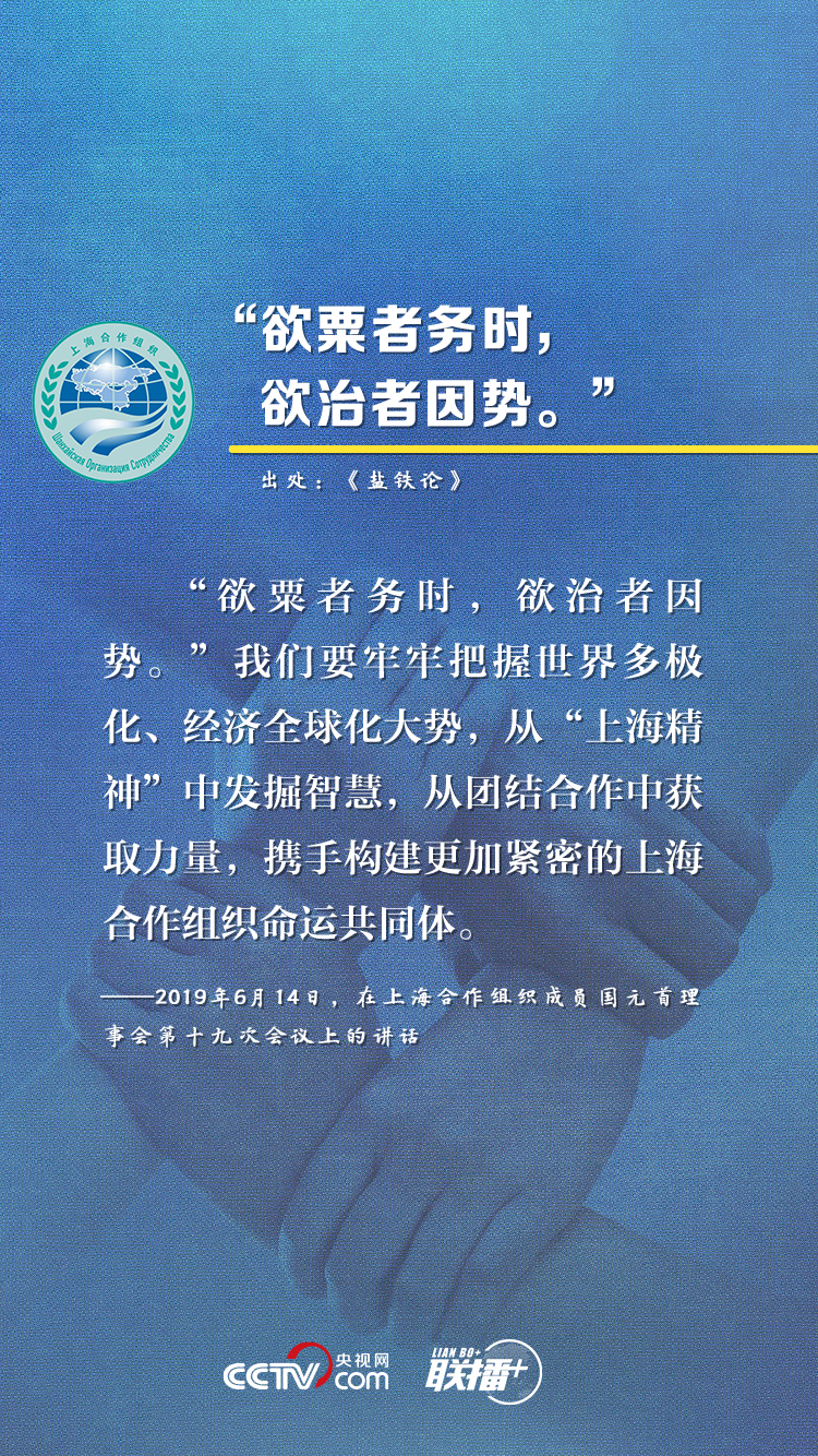 上海合作组织成立19年来,始终保持健康稳定发展势头,成功探索出一条新型区域组织的合作与发展道路。近年来,习近平主席在参加上合组织峰会时多次引用典故,就上合组织发展提出建议,这也成为他对上合之“合”的生动阐释。央视网《联播+》栏目特对相关内容进行梳理,与您一起感受“上海精神”的强劲动力。